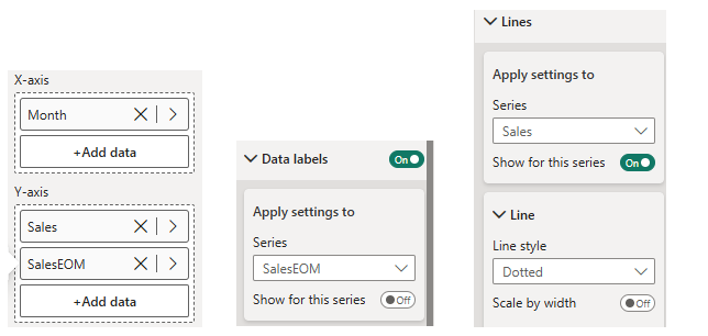 Next, I included this new measure in my visual along with Total sales, changed the Total Sales to dotted line and removed data labels for the new measure.