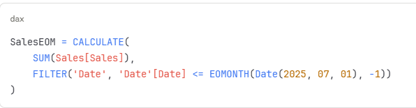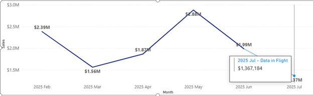 Note: I’m using the hardcoded Date(2025, 07, 01) for illustration only. Use the built-in TODAY() function, and the measure automatically adjusts to show data through the previous complete month.